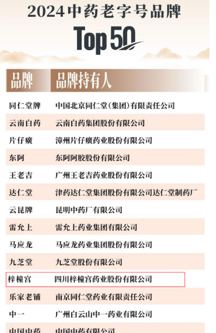 梓橦宮藥業成功入選2024中藥老字號品牌TOP50