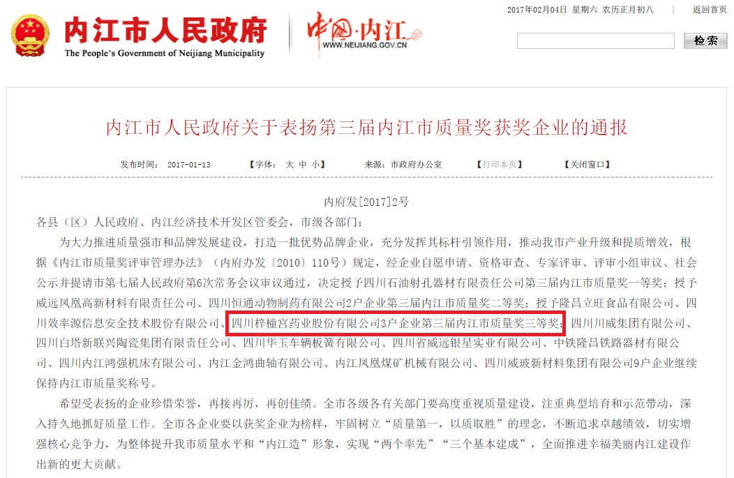 06 17-02熱烈(lie)慶祝四川梓橦宮藥業股份(fen)有限公司榮獲第三(san)屆內江市(shi)質量獎三(san)等(deng)獎。