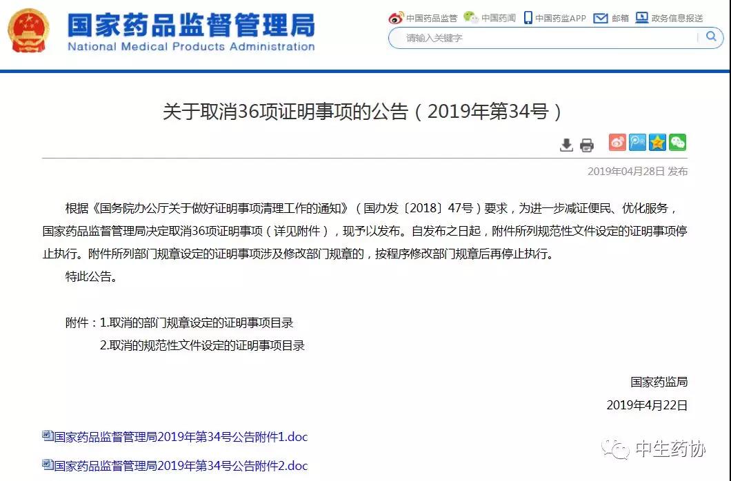 國家藥品監督管理局:關于取消36項證明事項的公告(2019年第34號)